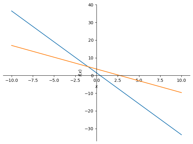 # To plot we need to enter the equations as y = f(x)y_eq1 = (3-7*x)/2y_eq2 = (11-4*x)/3# Then plot - the should intersect at the correct points. In this case (-1,5)plt = sp.plot(y_eq1,y_eq2)