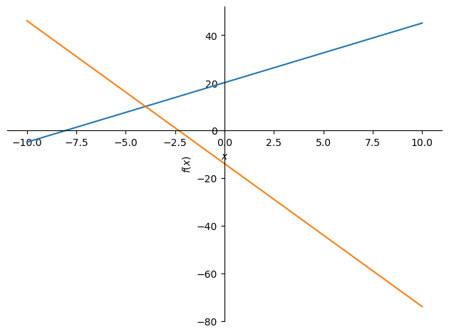 # To plot we need to enter the equations as y = f(x)y_eq1 = (4+x/2)*5y_eq2 = (-7-3*x)*2# Then plot - the should intersect at the correct points. In this case (-4,10)plt = sp.plot(y_eq1,y_eq2)