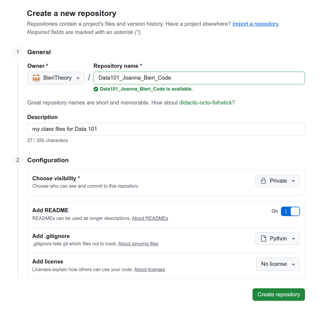 GitHub Home Repo This will send you to a page that you can fill out to create your repo. You should enter a file name that is easy to search for and different from FALL25. You can choose to make your repo public or private. I usually add a README file and choose a Python .gitignore.