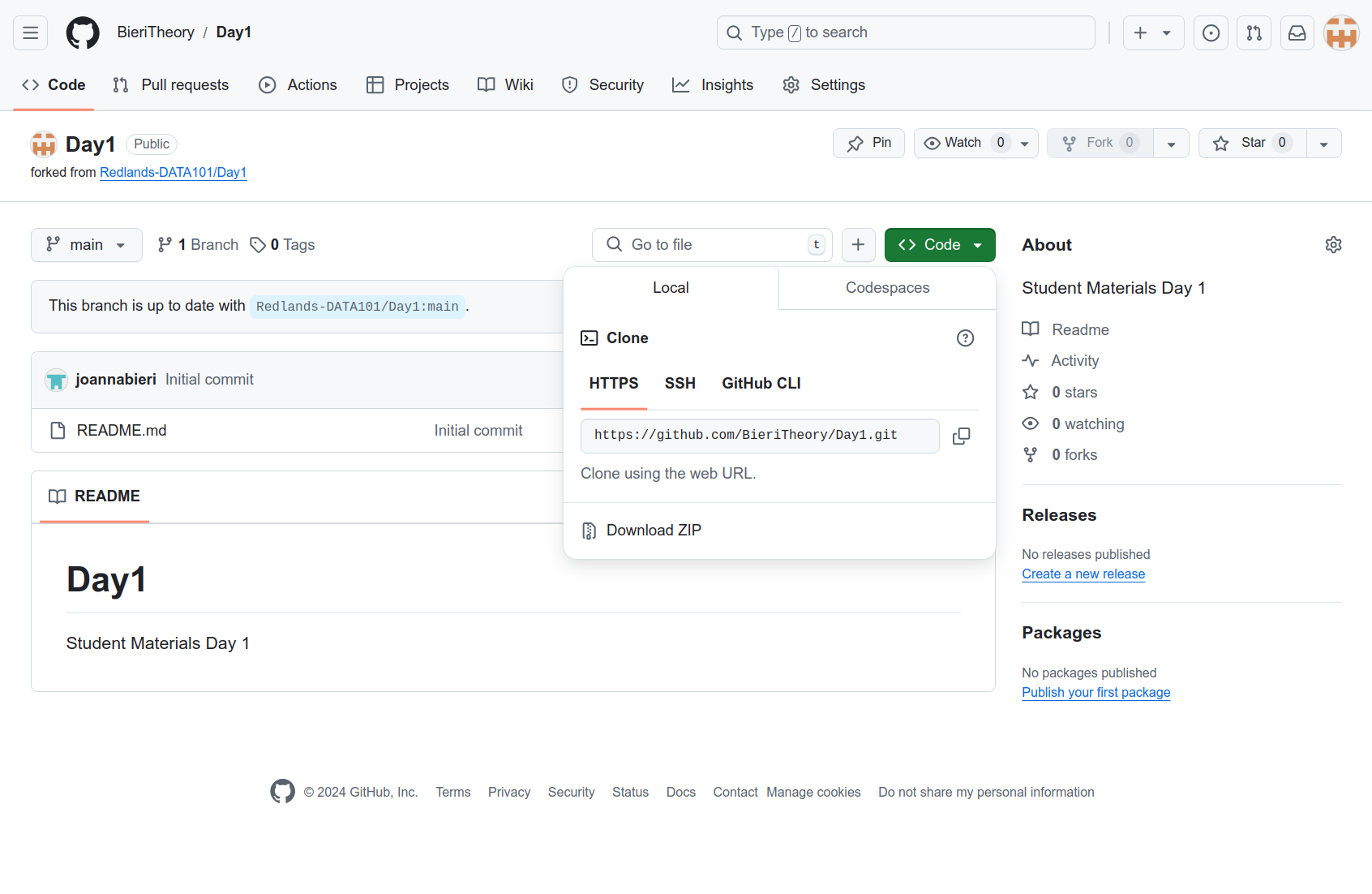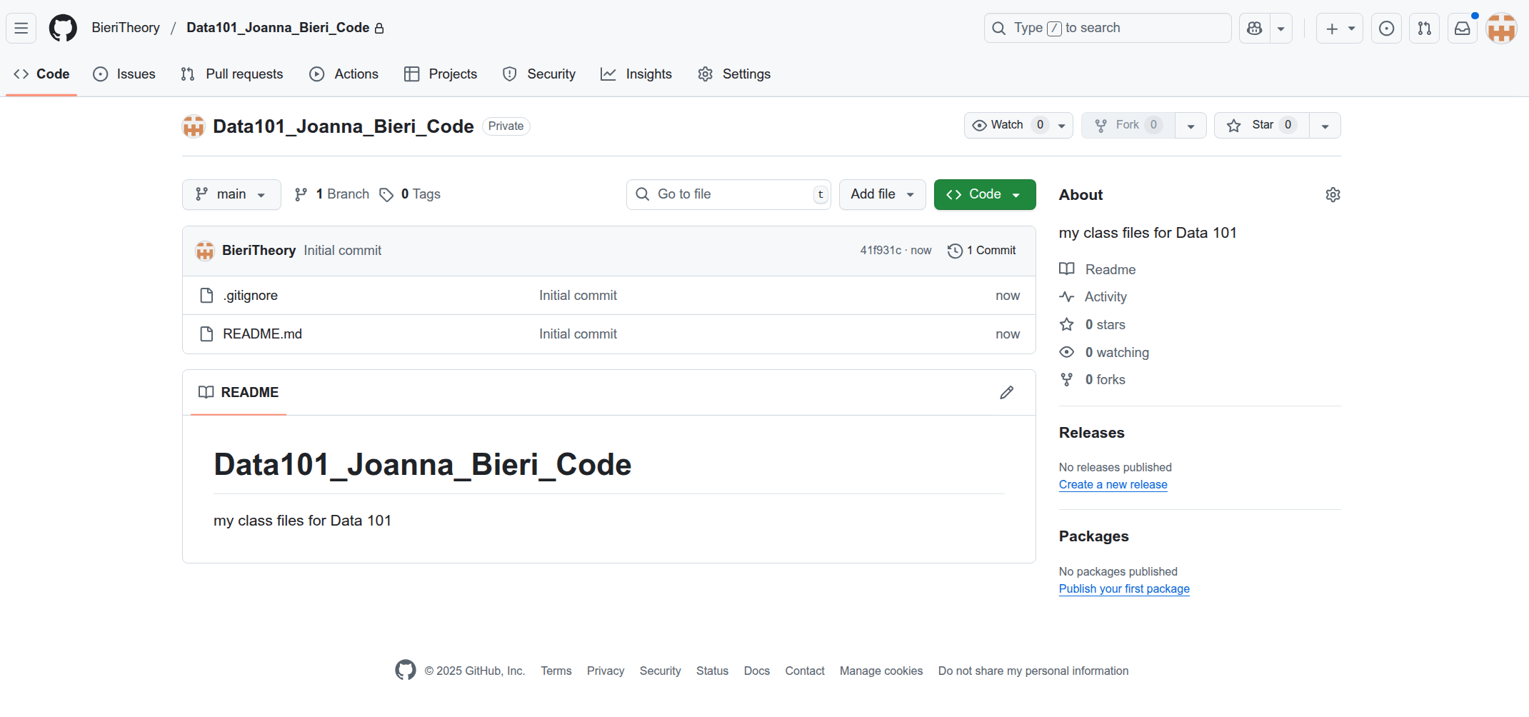 - You will want a Git repo just for your work. This is where you will store a backup of all the code you write in class. Later in the class we will learn how to collaborate using Git.