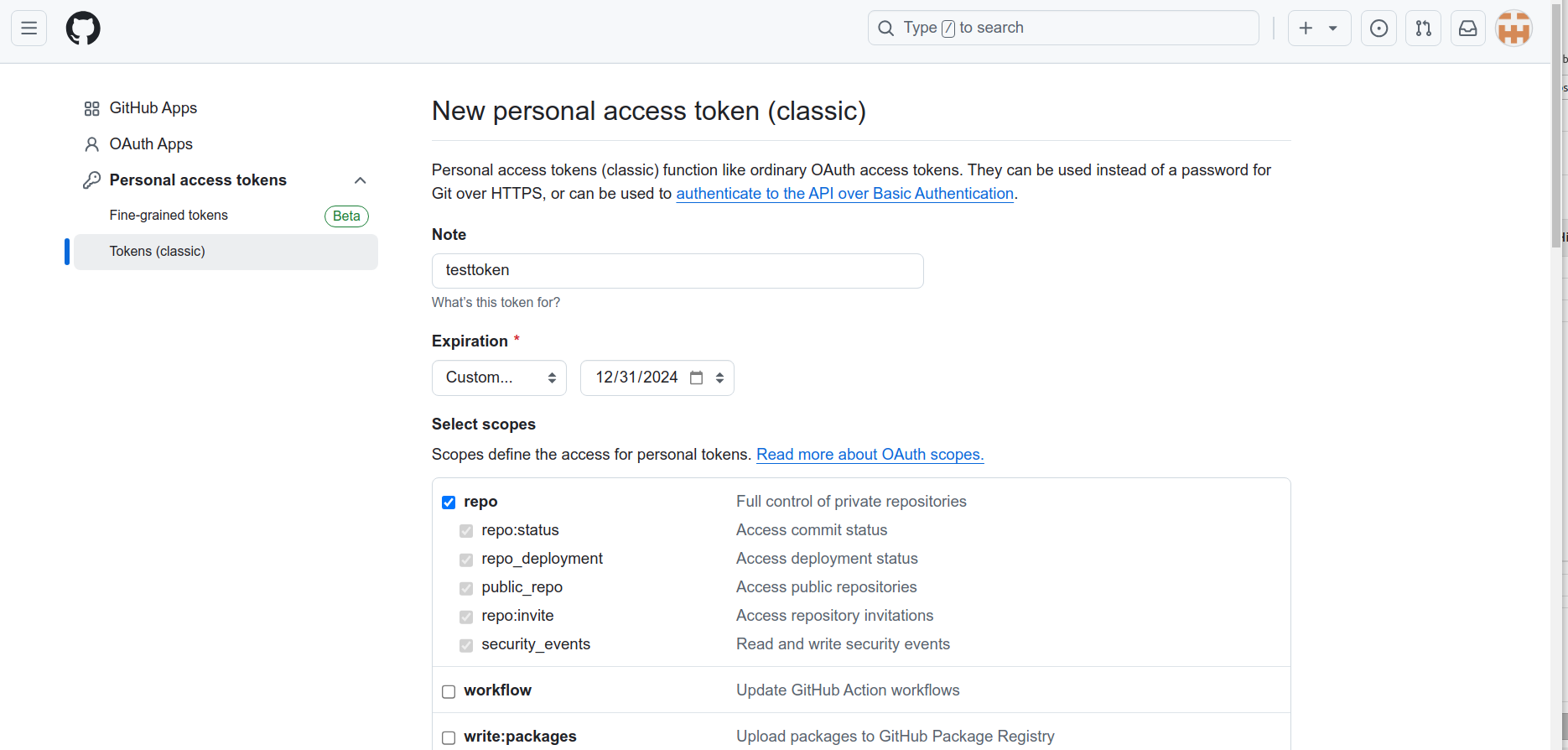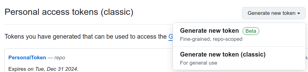 Then click on the link on the right named Generate new token and choose Generate new token (classic) from the drop down menu.